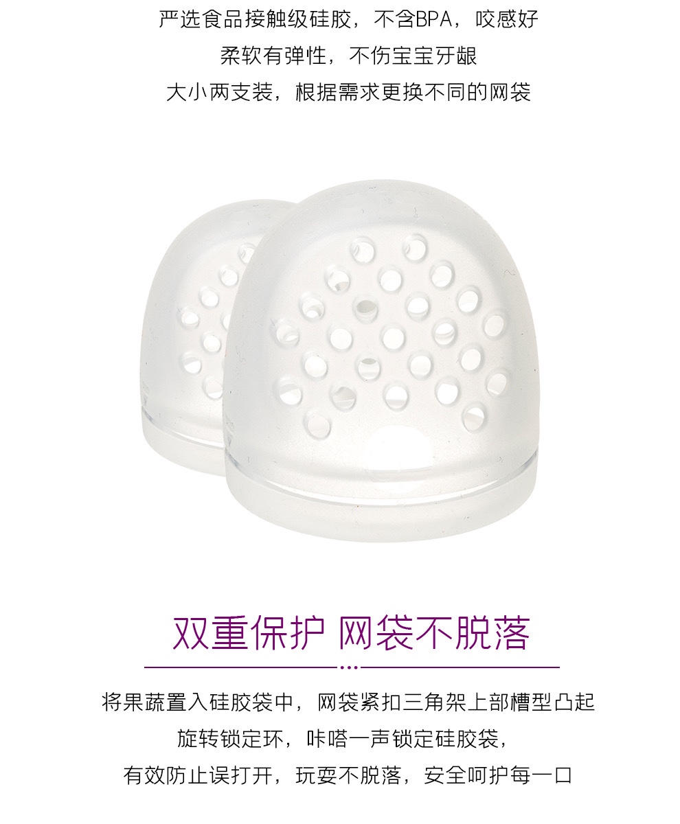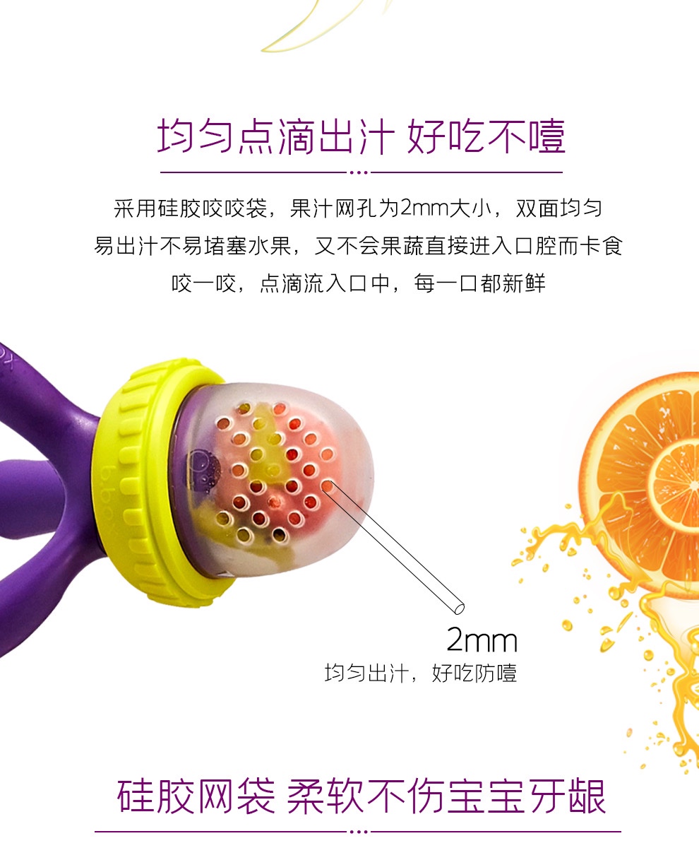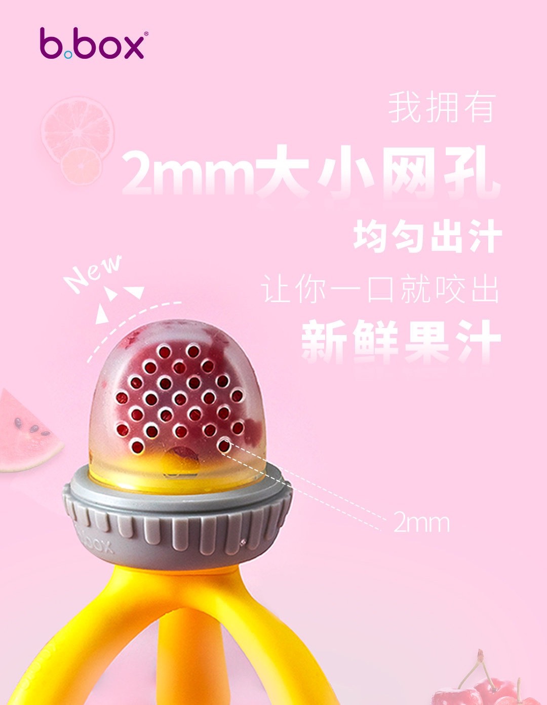 1、2mm大小网孔,出汁均匀,咬咬就能吃到新鲜果汁,保护宝宝不被大块果肉噎到