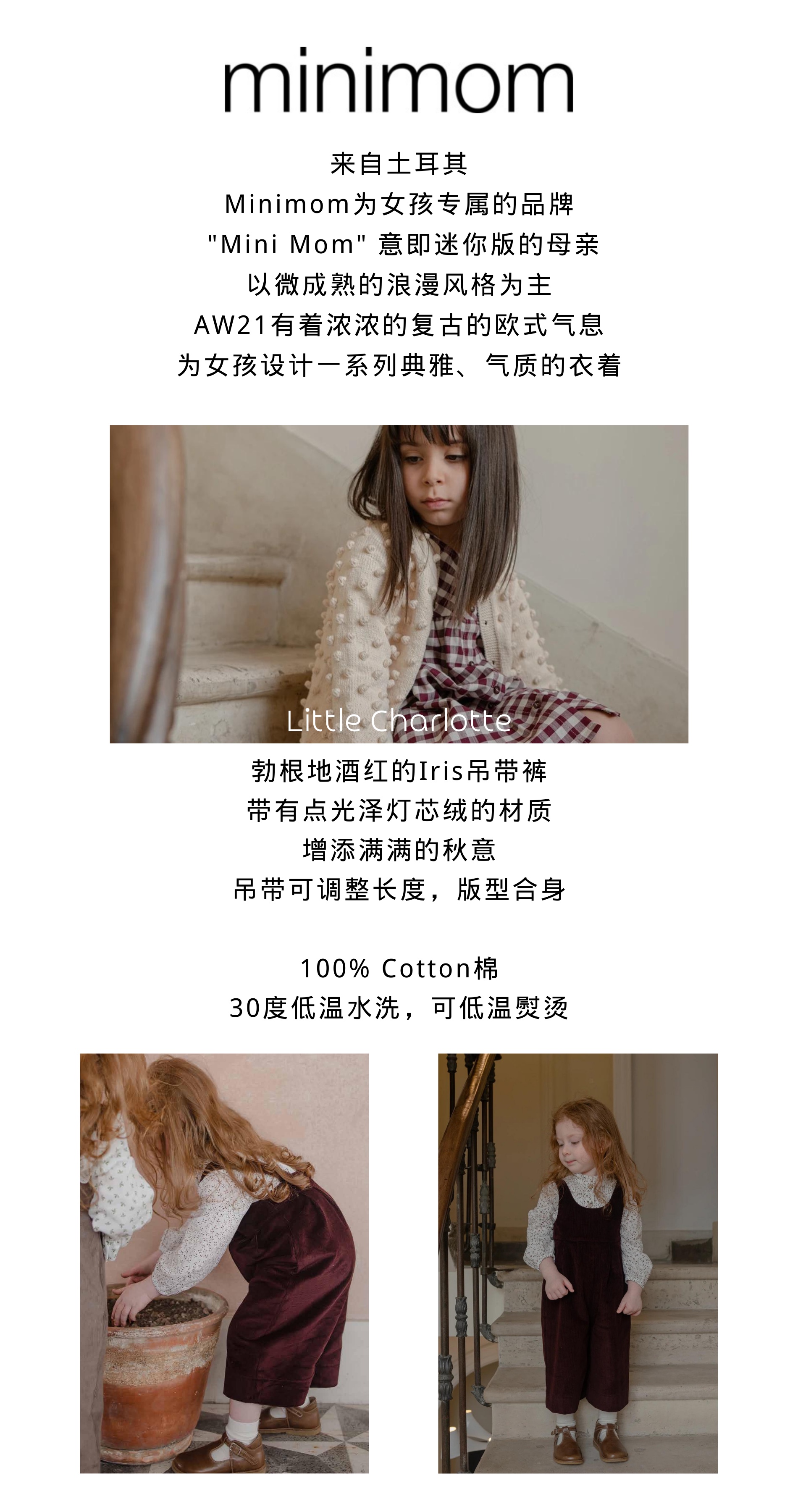 秋冬新品 | 土耳其minimom高档童装女童灯芯绒酒红色可调节吊带裤