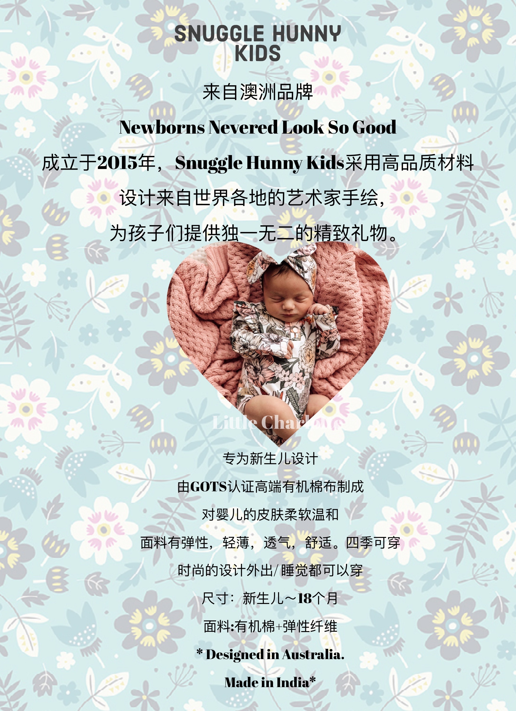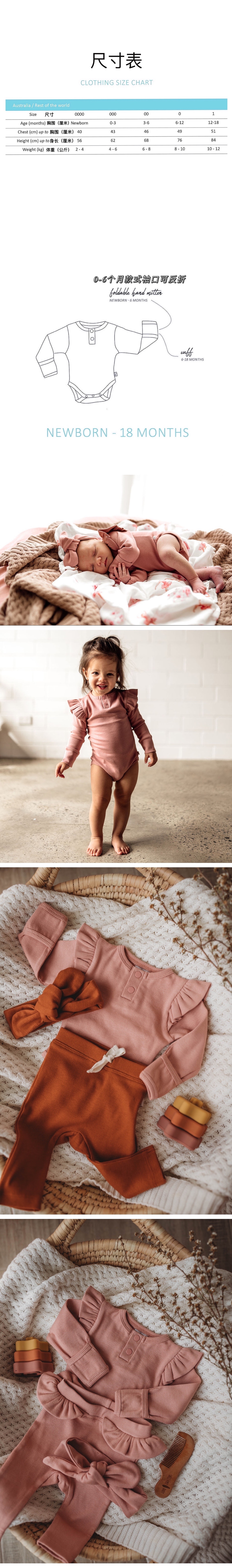 专为新生儿设计,由GOTS认证高端有机棉布制成,对婴儿的皮肤柔软温和,面料有弹性、轻薄、透气、舒适,四季可穿。时尚的设计,外出/睡觉都可以穿,尺寸:新生儿~18个月,面料:有机棉+弹性纤维。