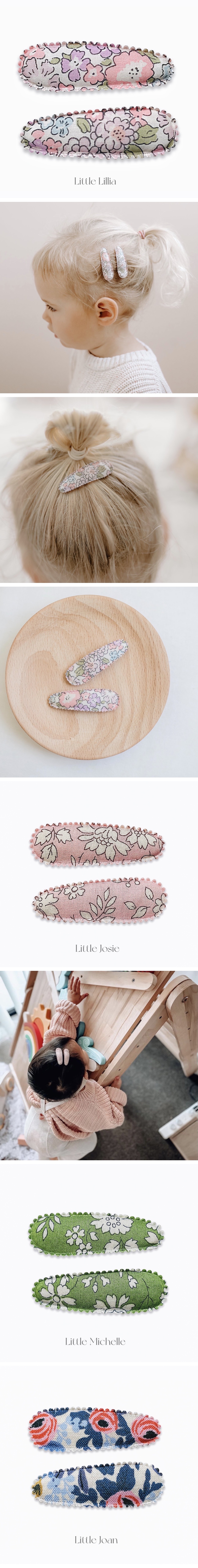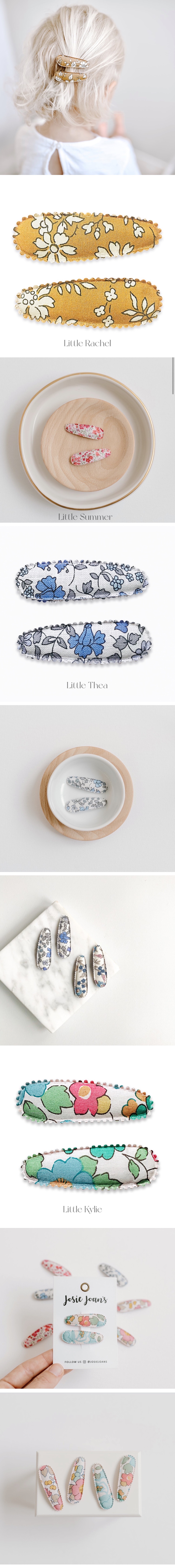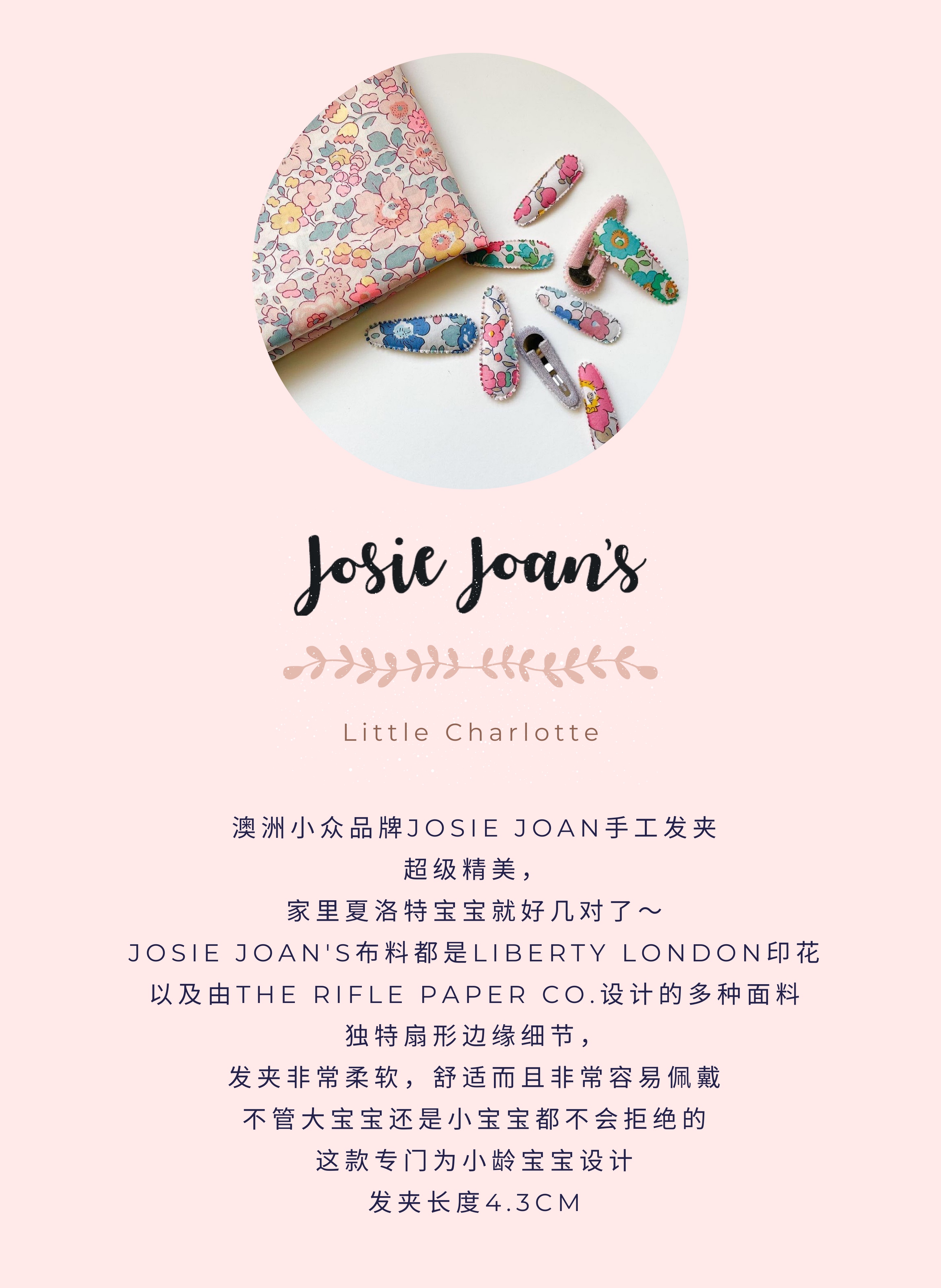 JOSIE JOAN'S布料都是LIBERTY LONDON印花以及由THE RIFLEPAPERCO.设计的多种面料,独特扇形边缘细节,发夹非常柔软,舒适而且非常容易佩戴,不管大宝宝还是小宝宝都不会拒绝的这款专门为小龄宝宝设计,发夹长度4.3CM。