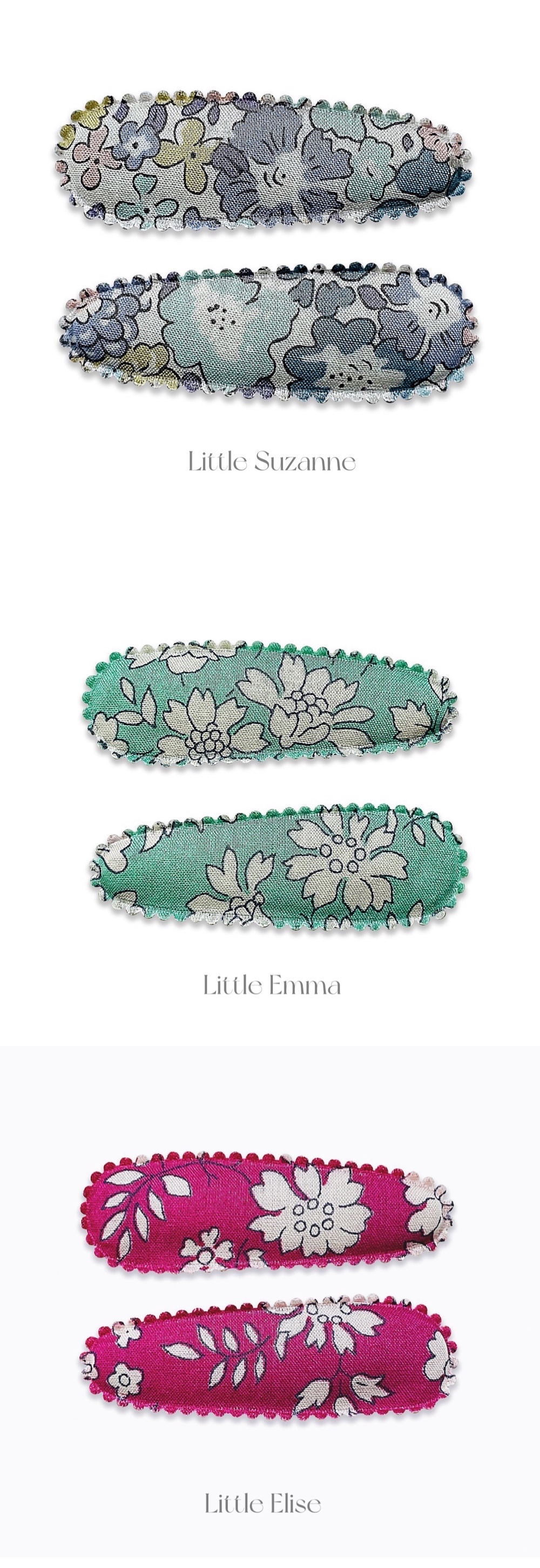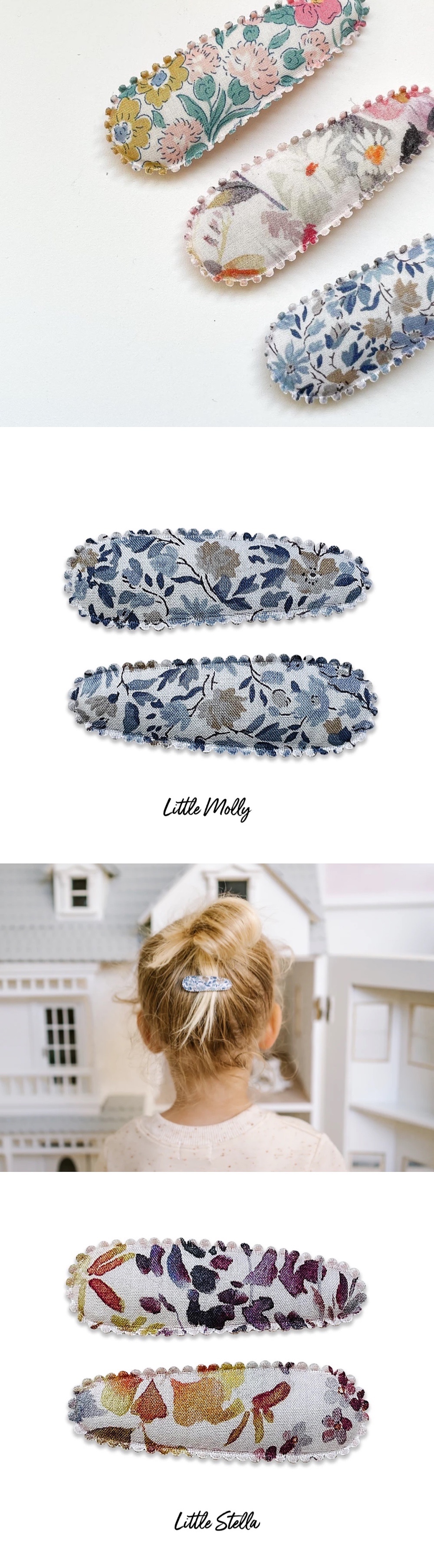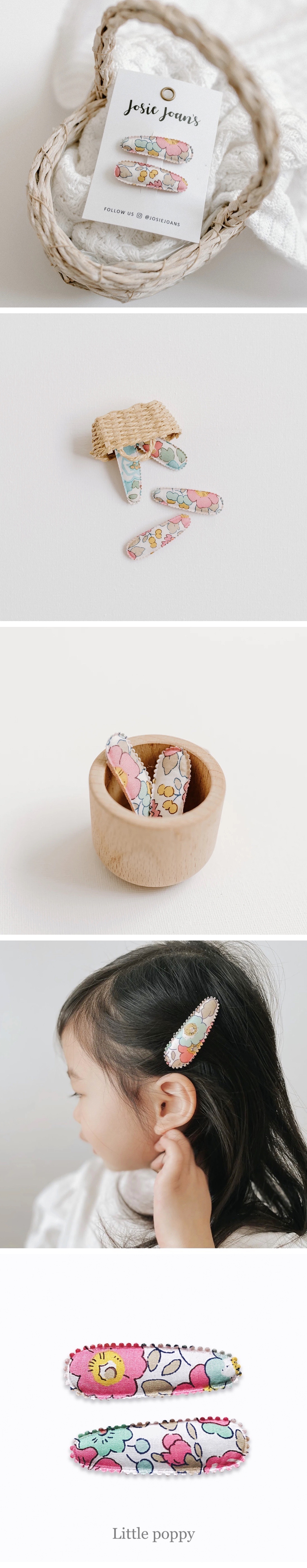 JOSIE JOAN'S布料都是LIBERTY LONDON印花以及由THE RIFLEPAPERCO.设计的多种面料,独特扇形边缘细节,发夹非常柔软,舒适而且非常容易佩戴,不管大宝宝还是小宝宝都不会拒绝的这款专门为小龄宝宝设计,发夹长度4.3CM。